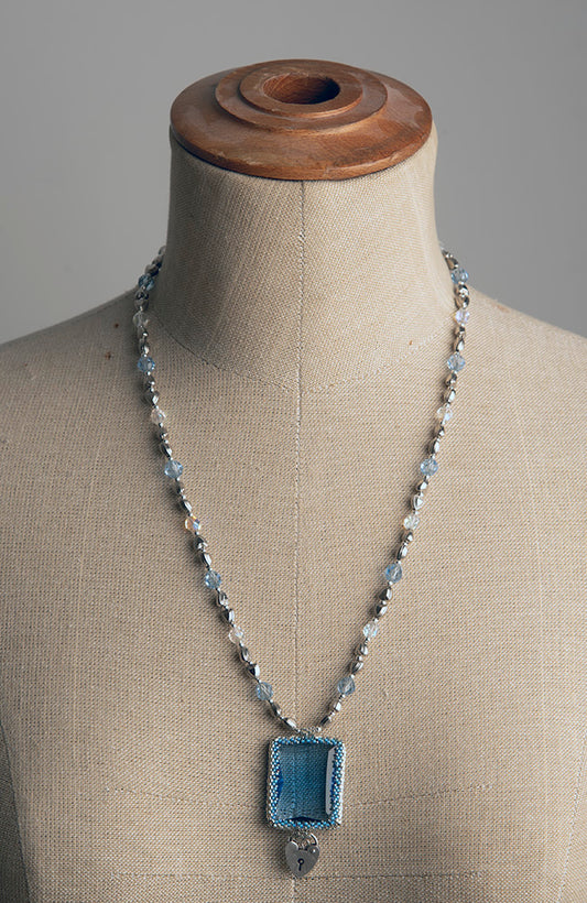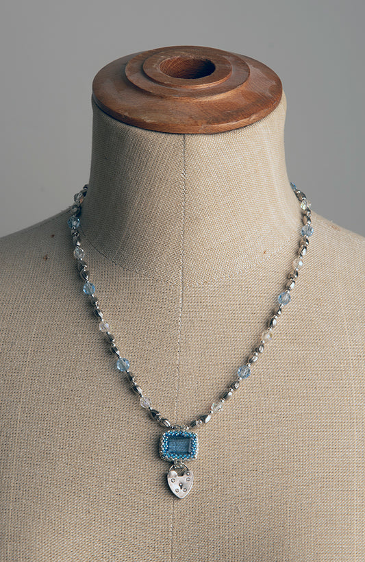 Handmade Necklace with Square Blue Pendant and Silver Heart