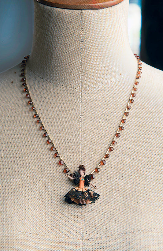 Miniature Spanish Dancer Doll on Hessonite Garnet Necklace